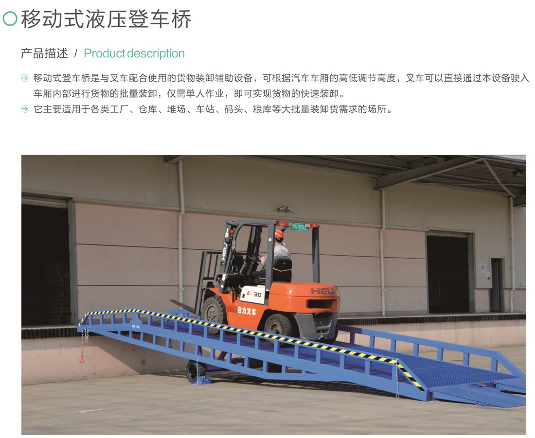 移動(dòng)式登車橋是與叉車配合使用的貨物裝卸輔助設(shè)備,可根據(jù)汽車車廂的高低調(diào)節(jié)高度,叉車可以直接通過(guò)本設(shè)備駛?cè)胲噹麅?nèi)部進(jìn)行貨物的批量裝卸,僅需單人作業(yè),即可實(shí)現(xiàn)貨物的快速裝卸。